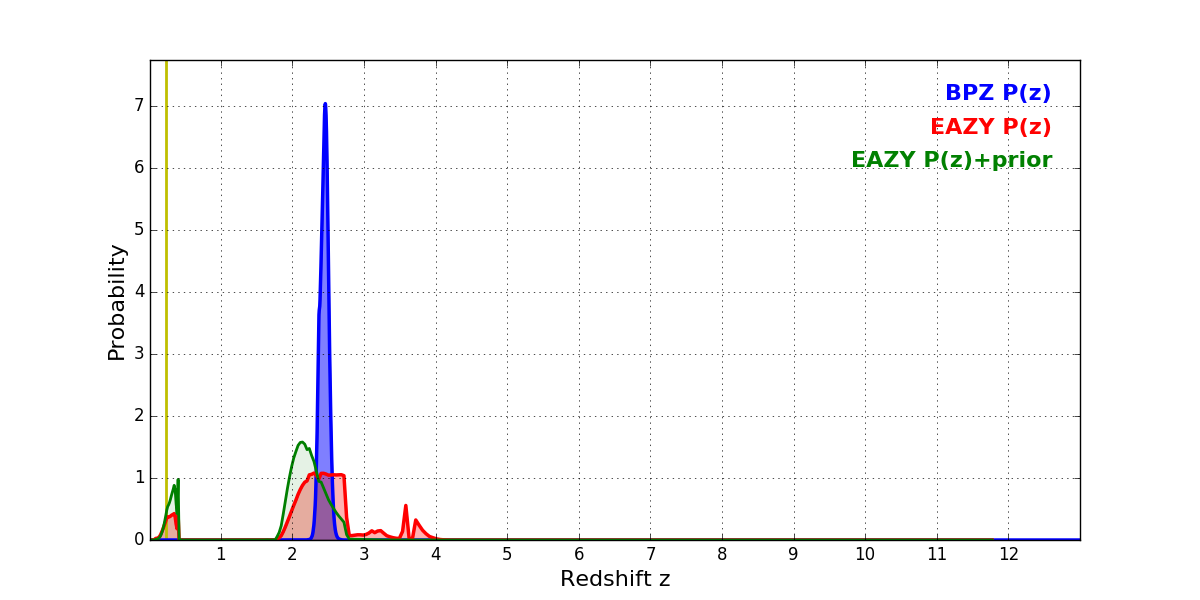 In P(z) plots: Yellow lines mark the cluster redshift z = 0.228,