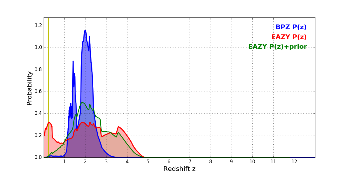 In P(z) plots: Yellow lines mark the cluster redshift z = 0.228,