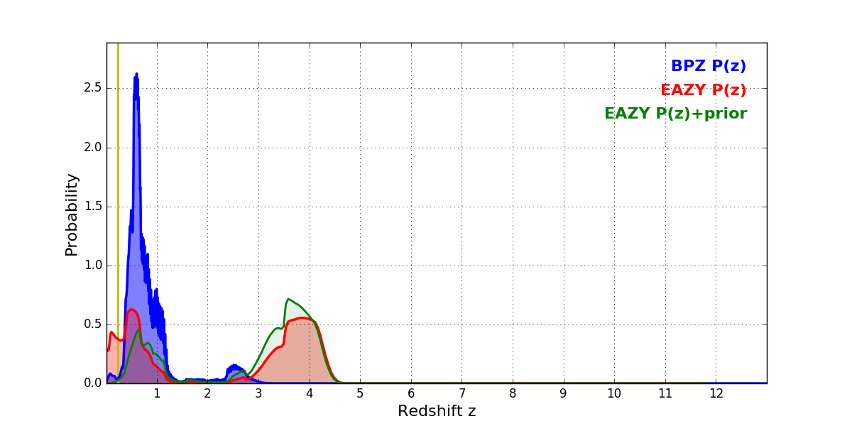 In P(z) plots: Yellow lines mark the cluster redshift z = 0.228,