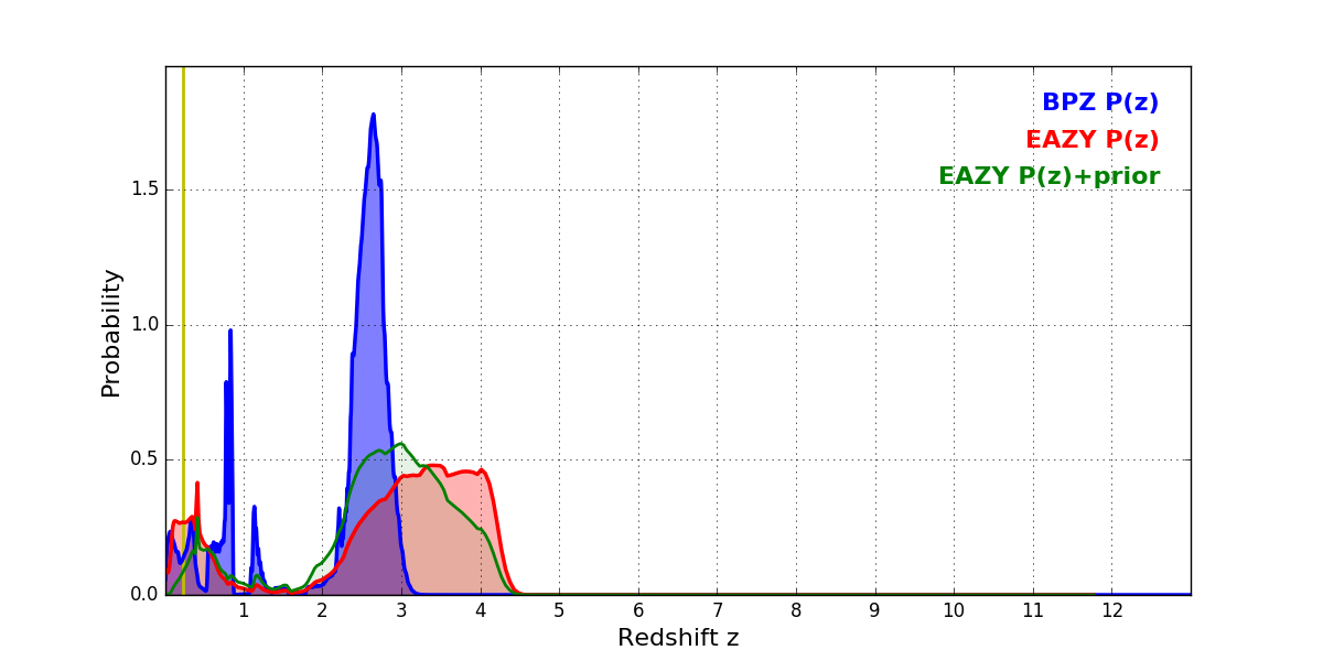 In P(z) plots: Yellow lines mark the cluster redshift z = 0.228,