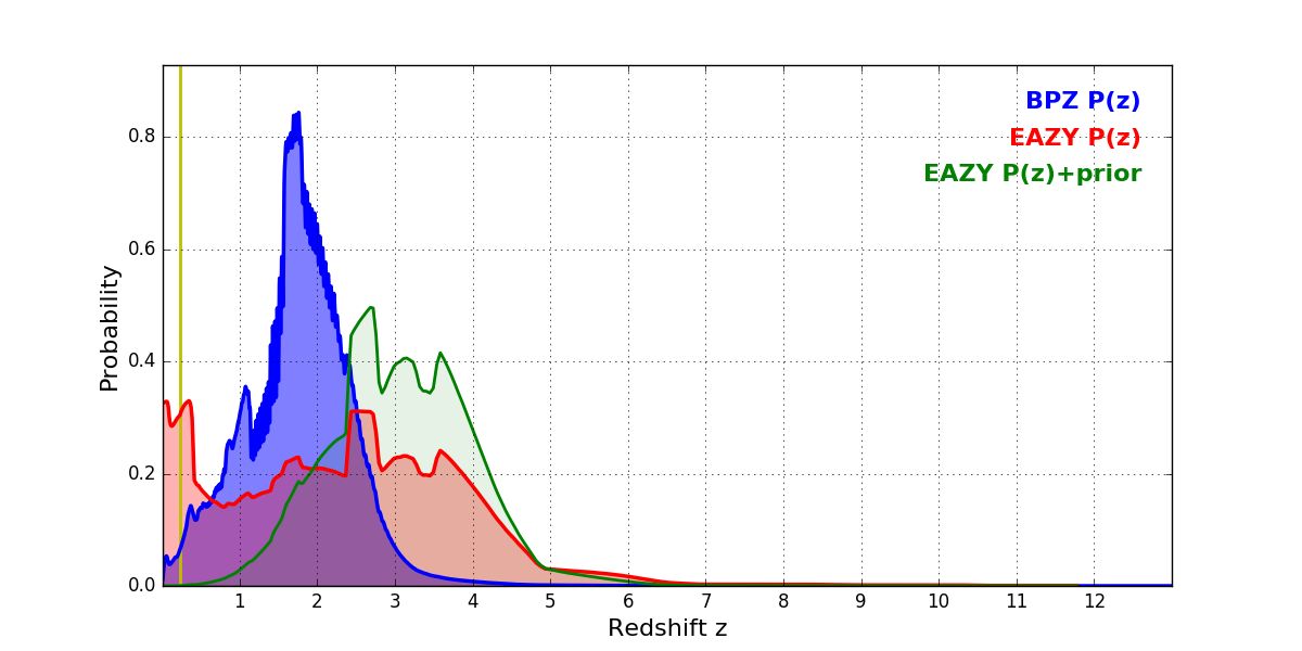 In P(z) plots: Yellow lines mark the cluster redshift z = 0.228,