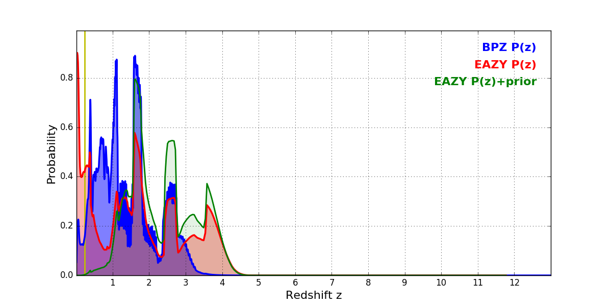 In P(z) plots: Yellow lines mark the cluster redshift z = 0.228,