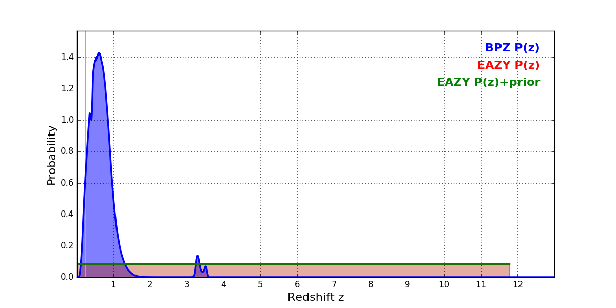 In P(z) plots: Yellow lines mark the cluster redshift z = 0.228,