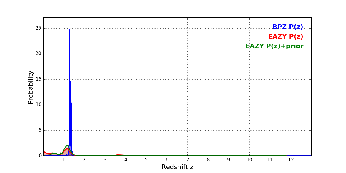 In P(z) plots: Yellow lines mark the cluster redshift z = 0.228,