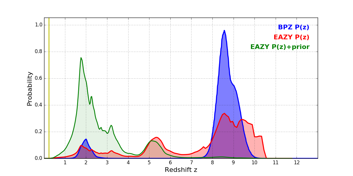 In P(z) plots: Yellow lines mark the cluster redshift z = 0.228,