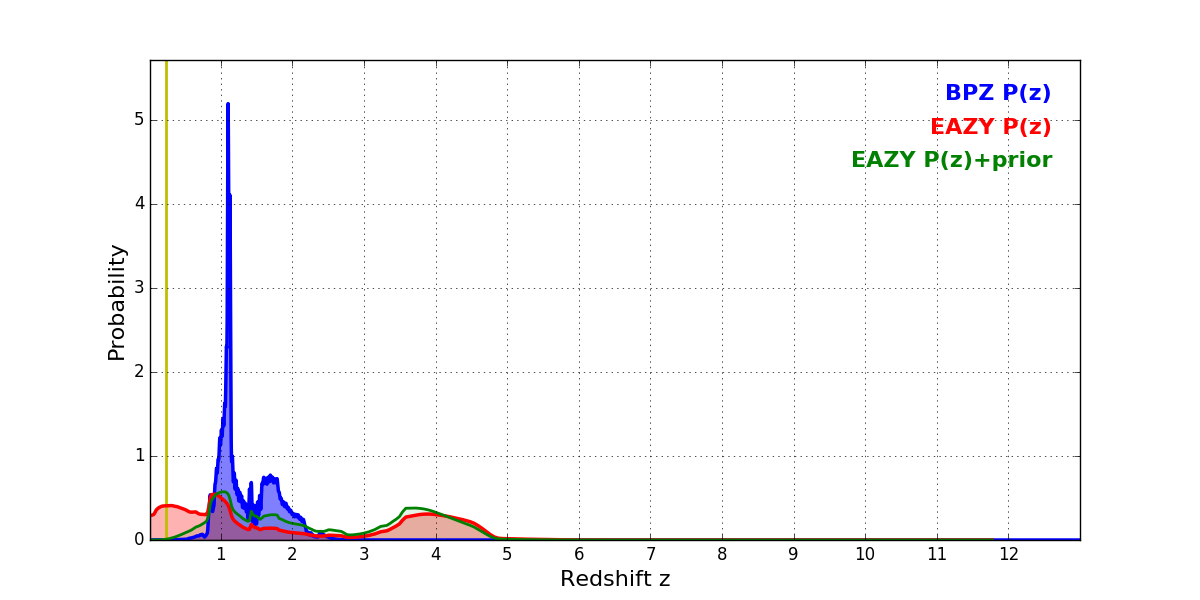 In P(z) plots: Yellow lines mark the cluster redshift z = 0.228,
