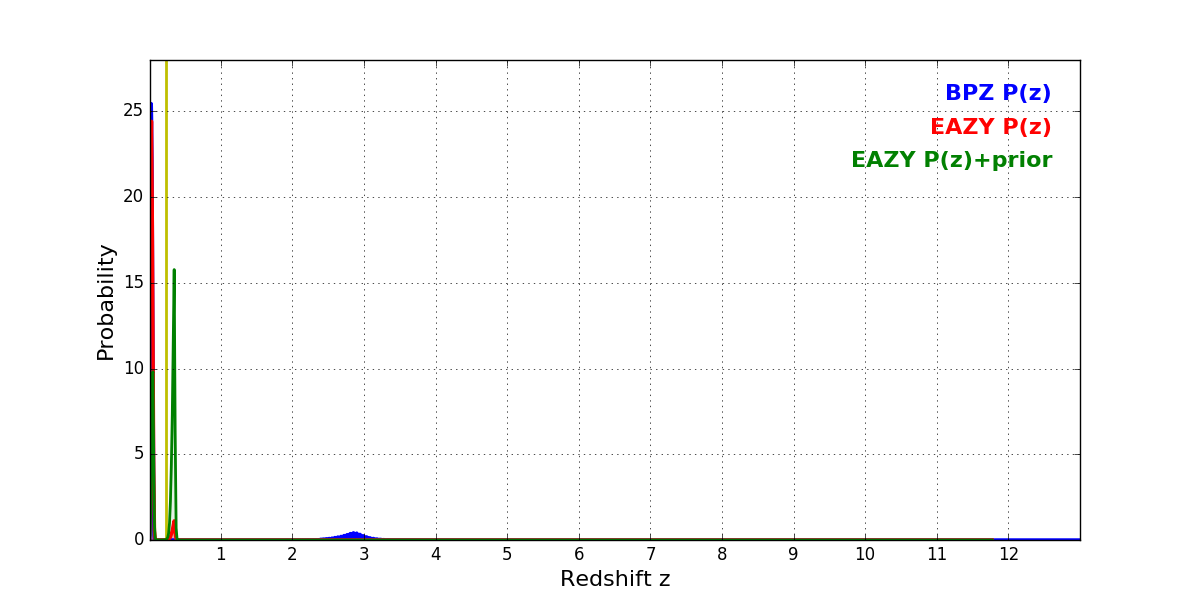 In P(z) plots: Yellow lines mark the cluster redshift z = 0.228,