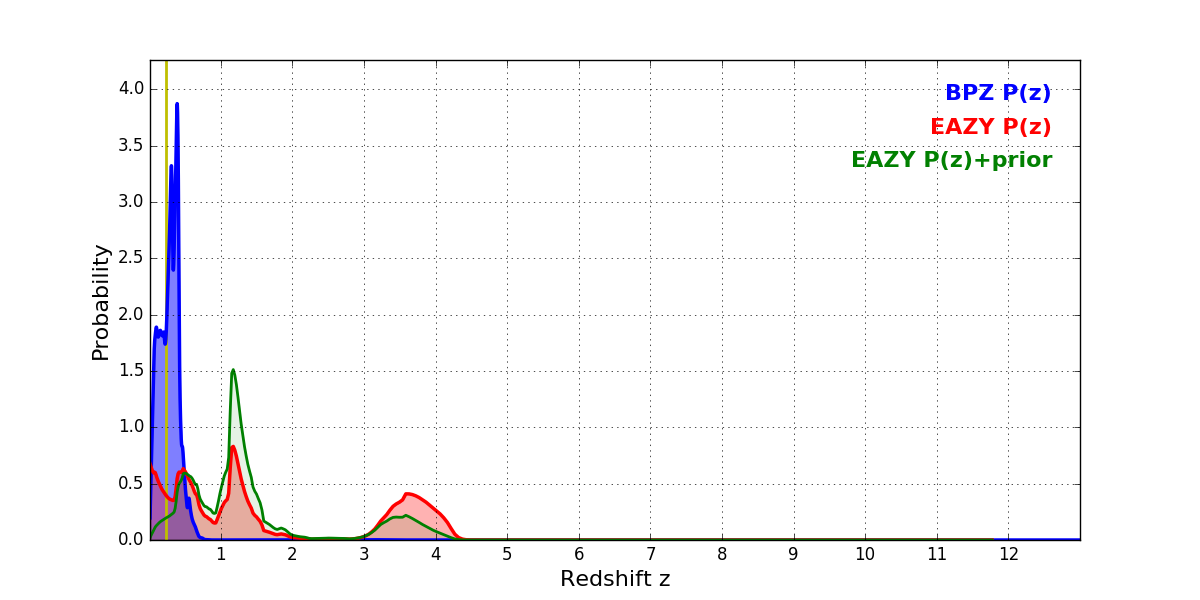 In P(z) plots: Yellow lines mark the cluster redshift z = 0.228,