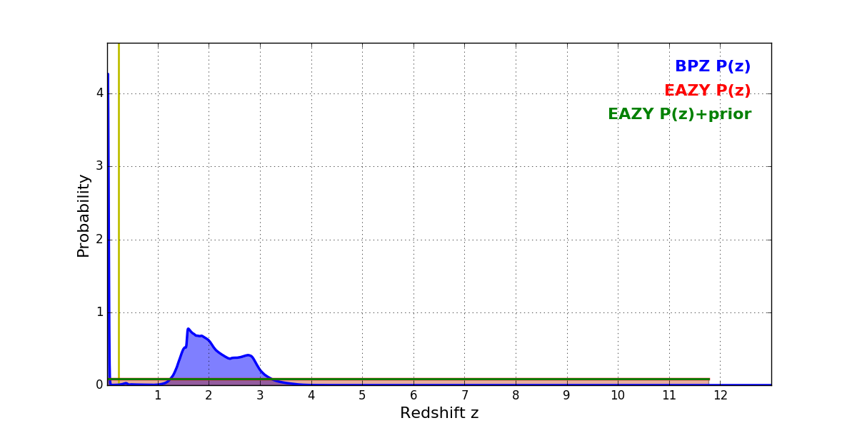 In P(z) plots: Yellow lines mark the cluster redshift z = 0.228,