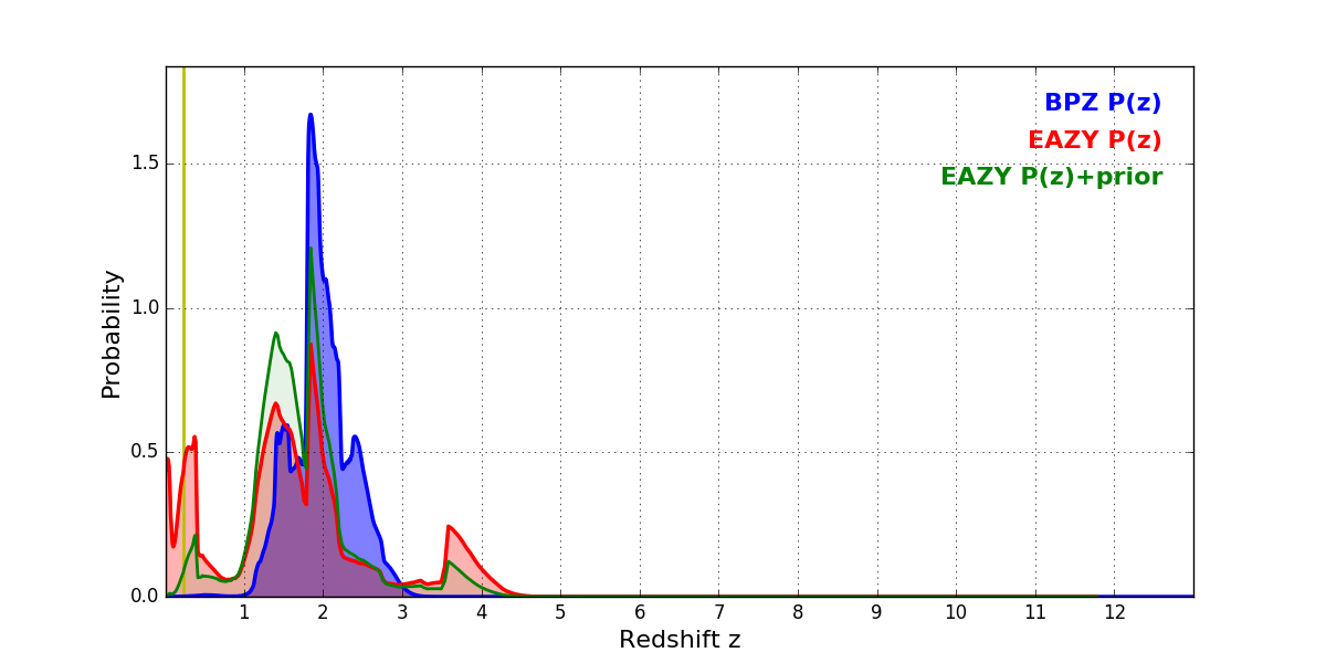 In P(z) plots: Yellow lines mark the cluster redshift z = 0.228,