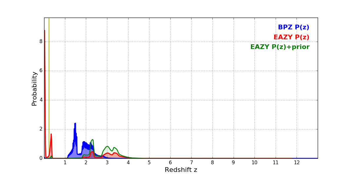 In P(z) plots: Yellow lines mark the cluster redshift z = 0.228,