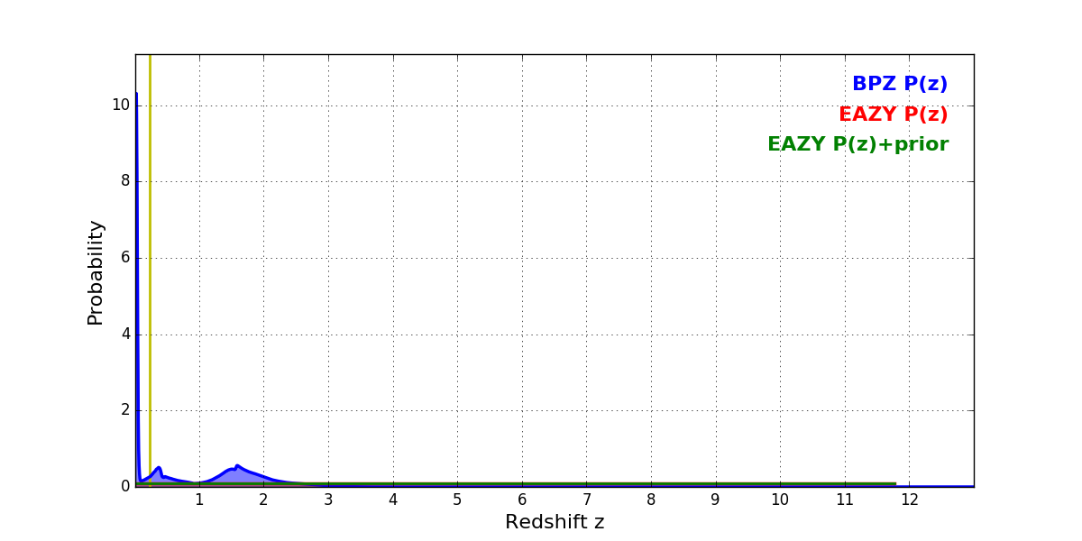 In P(z) plots: Yellow lines mark the cluster redshift z = 0.228,