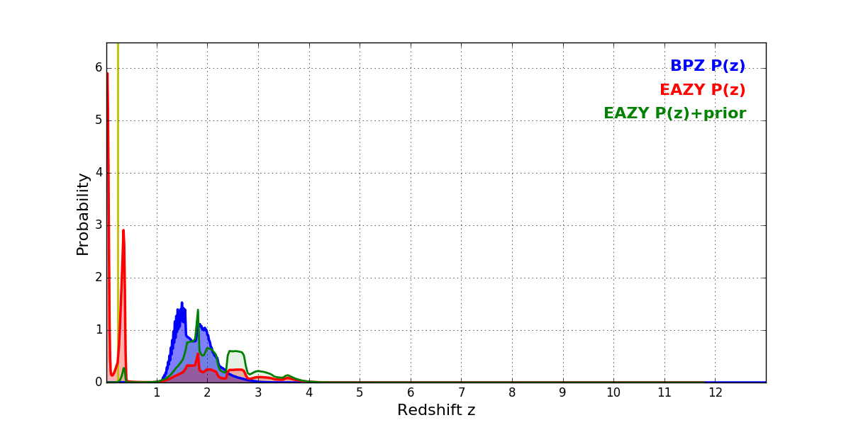 In P(z) plots: Yellow lines mark the cluster redshift z = 0.228,