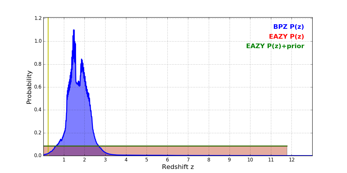 In P(z) plots: Yellow lines mark the cluster redshift z = 0.228,