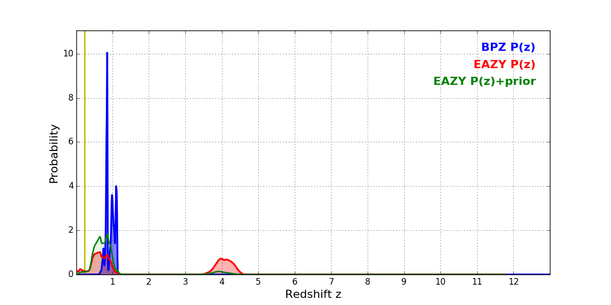 In P(z) plots: Yellow lines mark the cluster redshift z = 0.228,