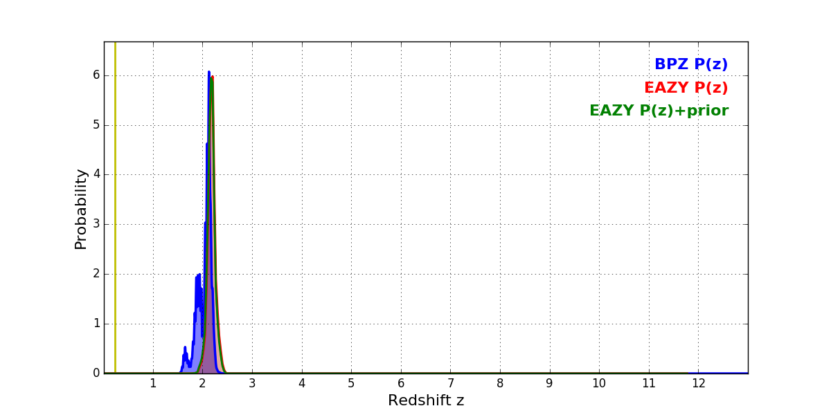 In P(z) plots: Yellow lines mark the cluster redshift z = 0.228,