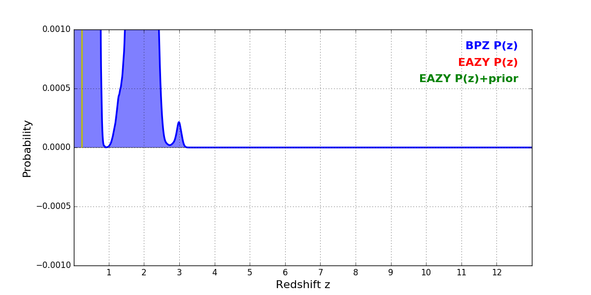 In P(z) plots: Yellow lines mark the cluster redshift z = 0.228,