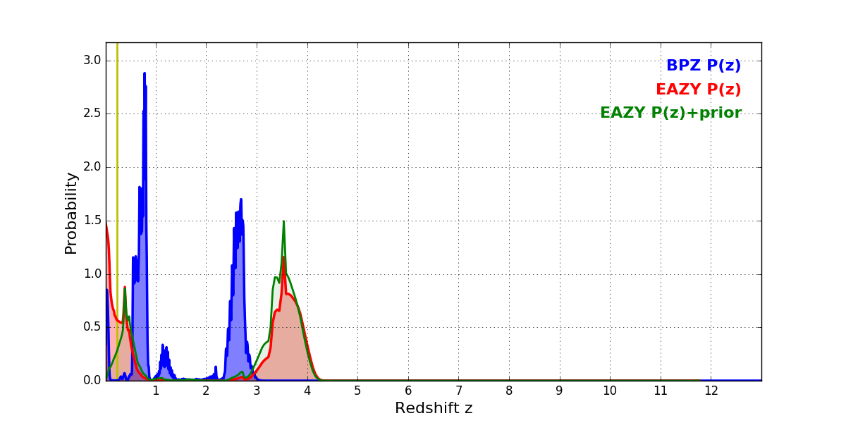In P(z) plots: Yellow lines mark the cluster redshift z = 0.228,