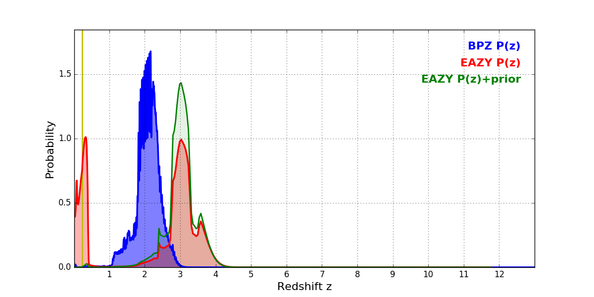 In P(z) plots: Yellow lines mark the cluster redshift z = 0.228,