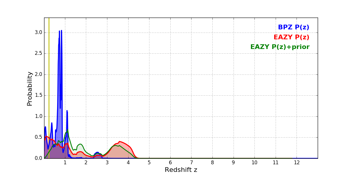 In P(z) plots: Yellow lines mark the cluster redshift z = 0.228,