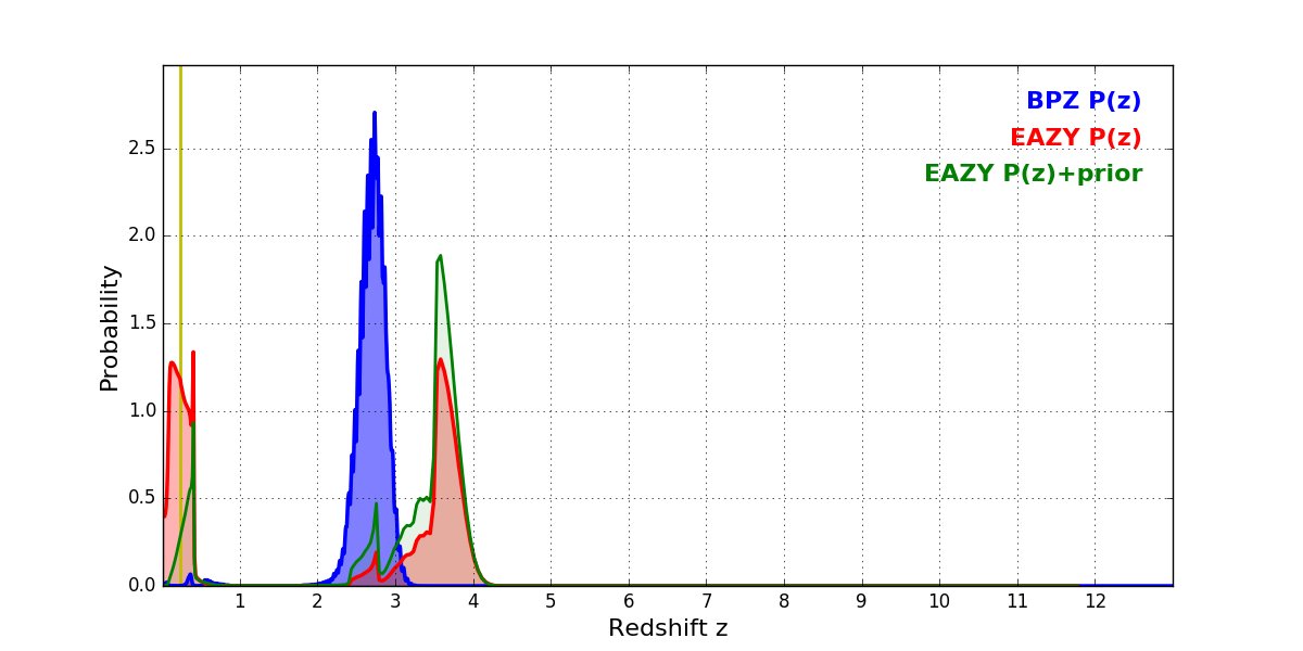 In P(z) plots: Yellow lines mark the cluster redshift z = 0.228,