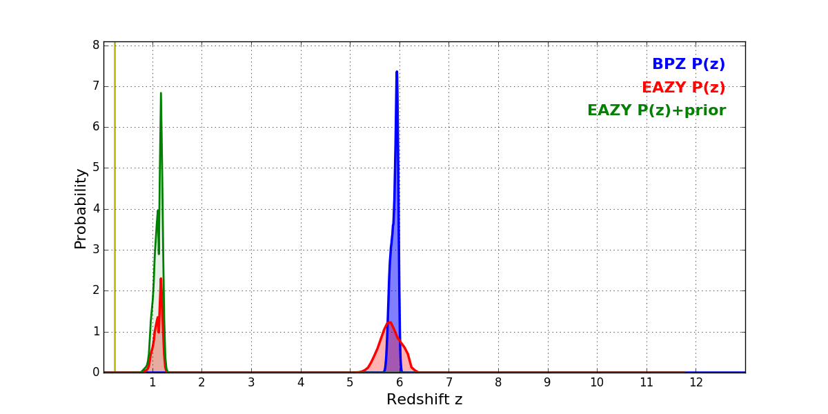 In P(z) plots: Yellow lines mark the cluster redshift z = 0.228,
