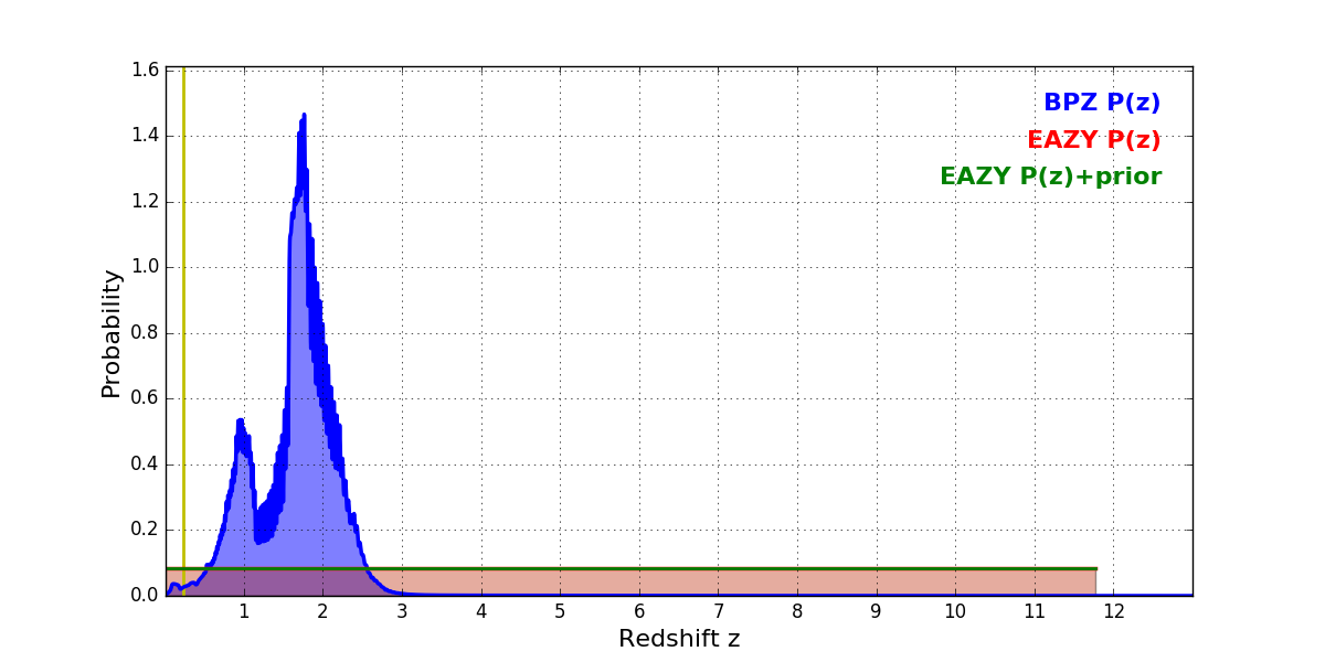 In P(z) plots: Yellow lines mark the cluster redshift z = 0.228,