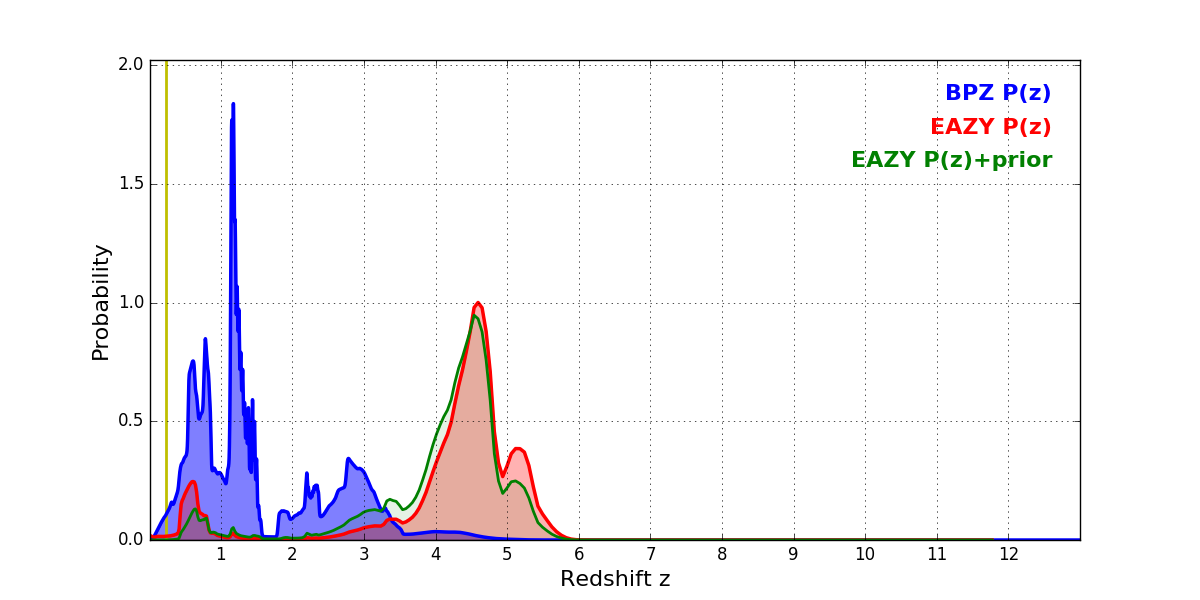 In P(z) plots: Yellow lines mark the cluster redshift z = 0.228,