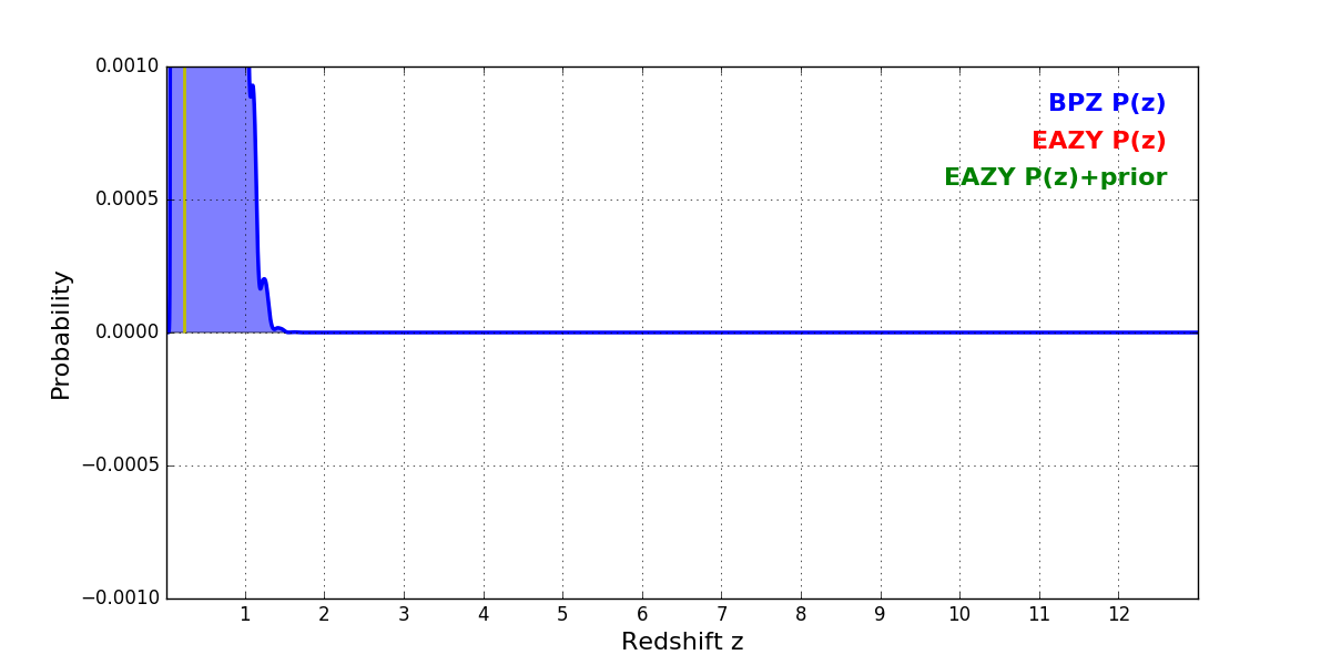 In P(z) plots: Yellow lines mark the cluster redshift z = 0.228,