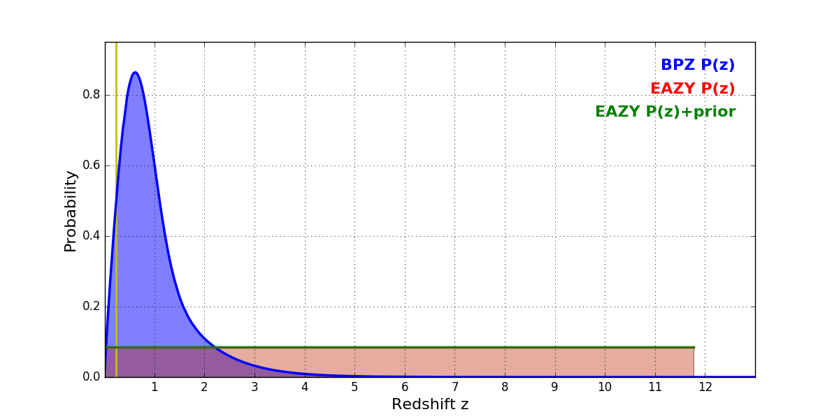 In P(z) plots: Yellow lines mark the cluster redshift z = 0.228,