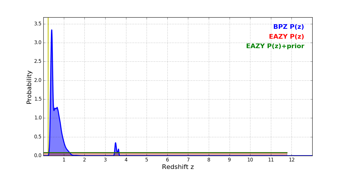 In P(z) plots: Yellow lines mark the cluster redshift z = 0.228,