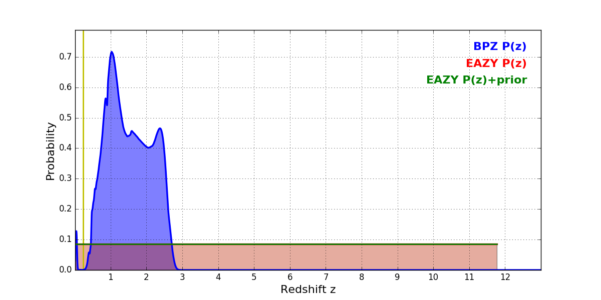 In P(z) plots: Yellow lines mark the cluster redshift z = 0.228,