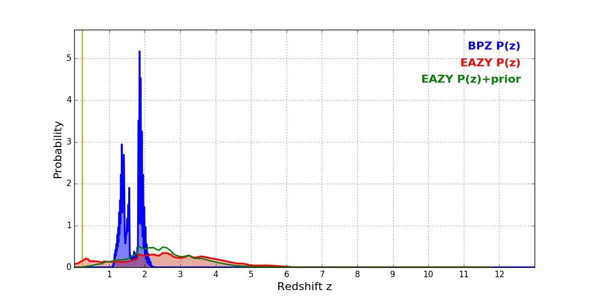 In P(z) plots: Yellow lines mark the cluster redshift z = 0.228,