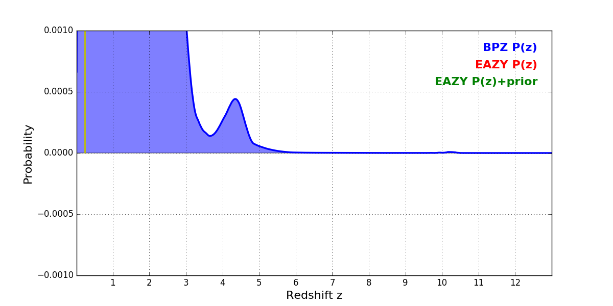 In P(z) plots: Yellow lines mark the cluster redshift z = 0.228,