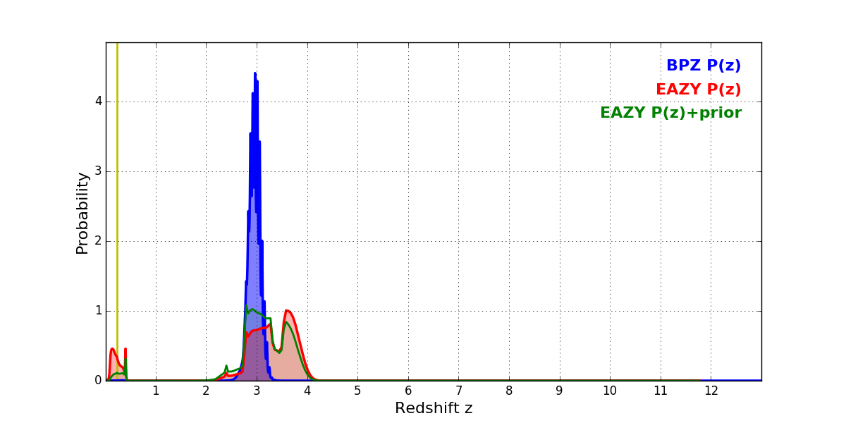 In P(z) plots: Yellow lines mark the cluster redshift z = 0.228,