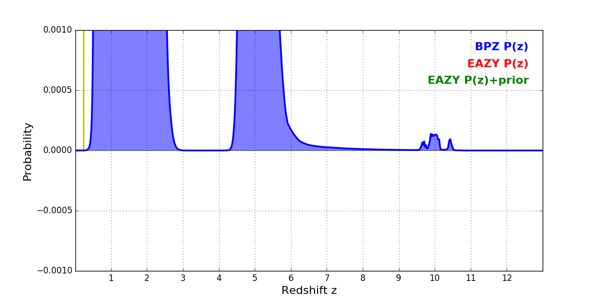 In P(z) plots: Yellow lines mark the cluster redshift z = 0.228,