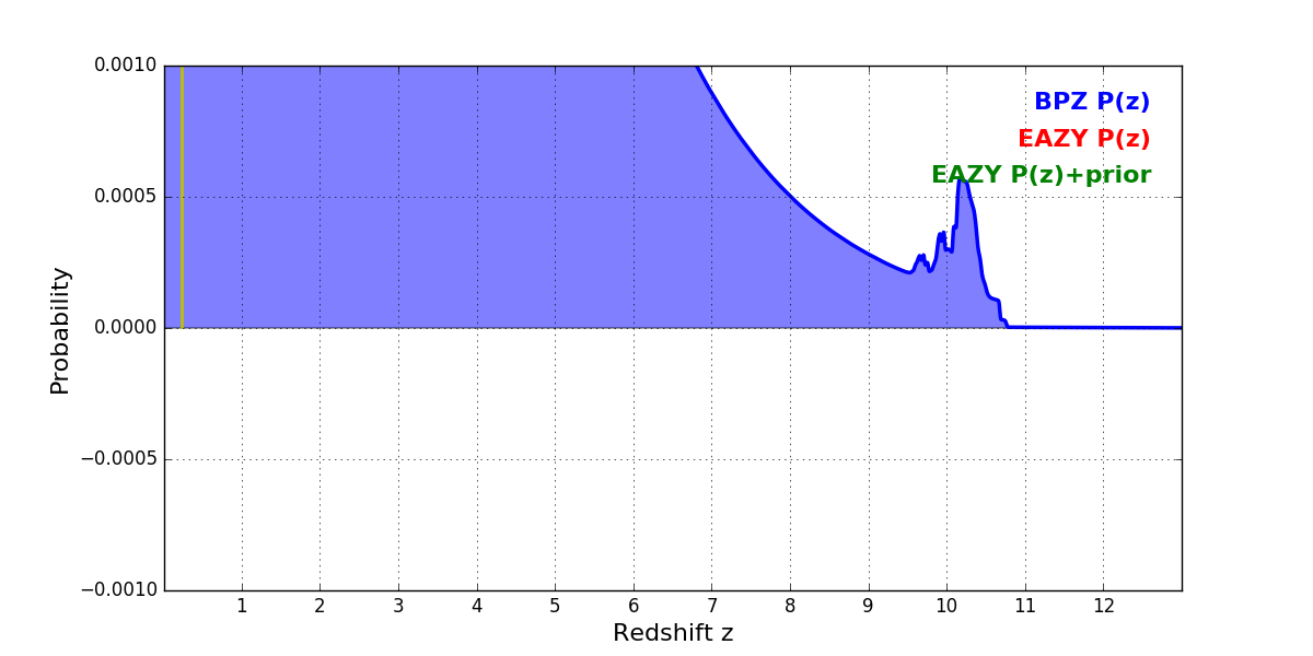 In P(z) plots: Yellow lines mark the cluster redshift z = 0.228,