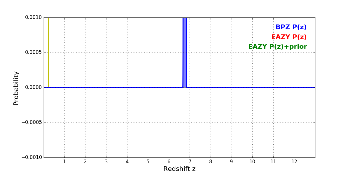 In P(z) plots: Yellow lines mark the cluster redshift z = 0.228,