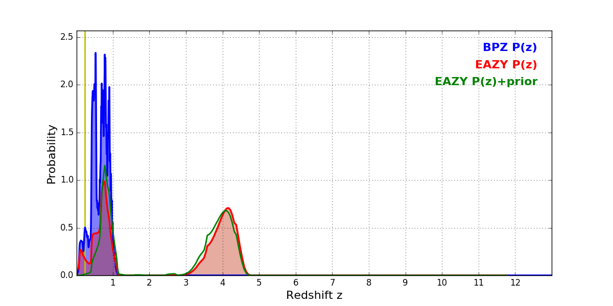 In P(z) plots: Yellow lines mark the cluster redshift z = 0.228,
