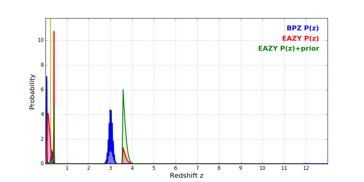 In P(z) plots: Yellow lines mark the cluster redshift z = 0.228,
