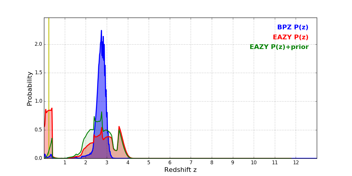 In P(z) plots: Yellow lines mark the cluster redshift z = 0.228,