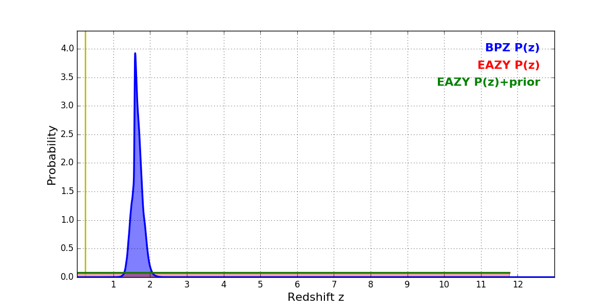 In P(z) plots: Yellow lines mark the cluster redshift z = 0.228,