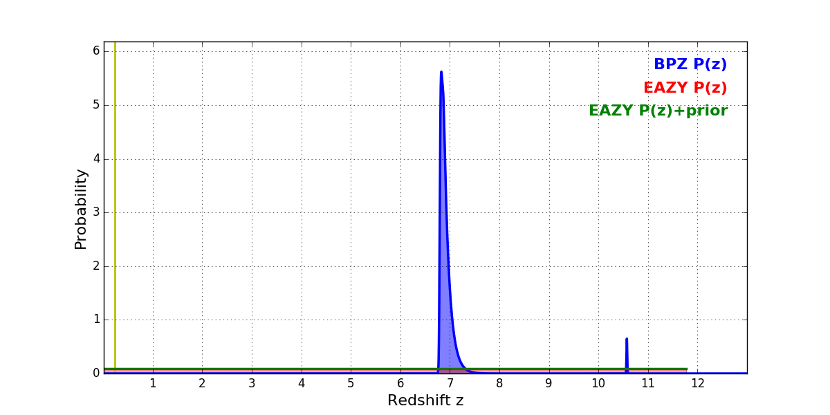 In P(z) plots: Yellow lines mark the cluster redshift z = 0.228,
