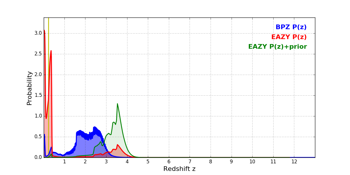 In P(z) plots: Yellow lines mark the cluster redshift z = 0.228,