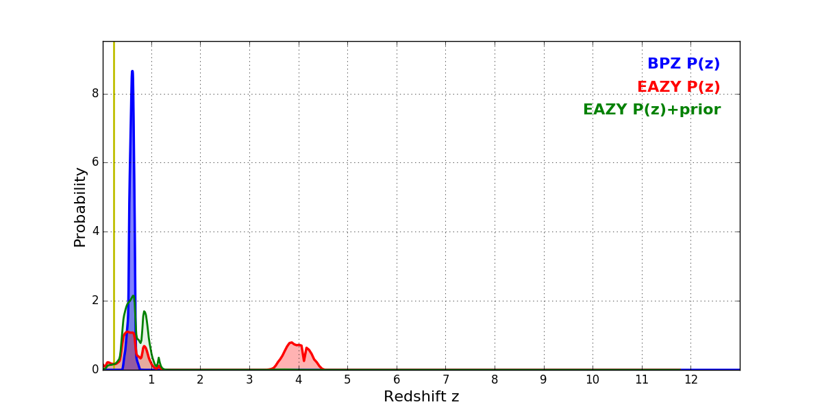 In P(z) plots: Yellow lines mark the cluster redshift z = 0.228,