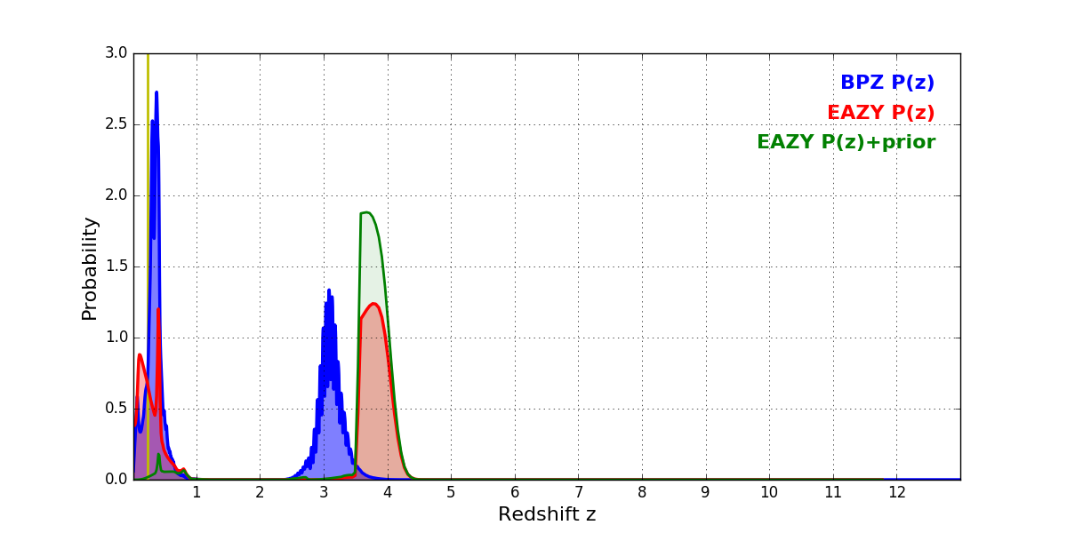 In P(z) plots: Yellow lines mark the cluster redshift z = 0.228,