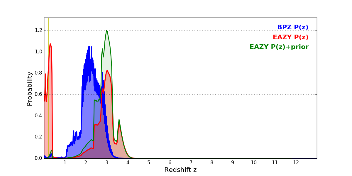 In P(z) plots: Yellow lines mark the cluster redshift z = 0.228,