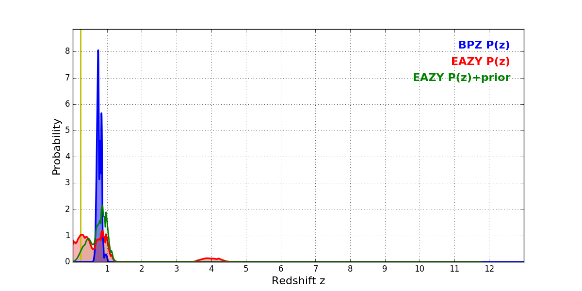 In P(z) plots: Yellow lines mark the cluster redshift z = 0.228,