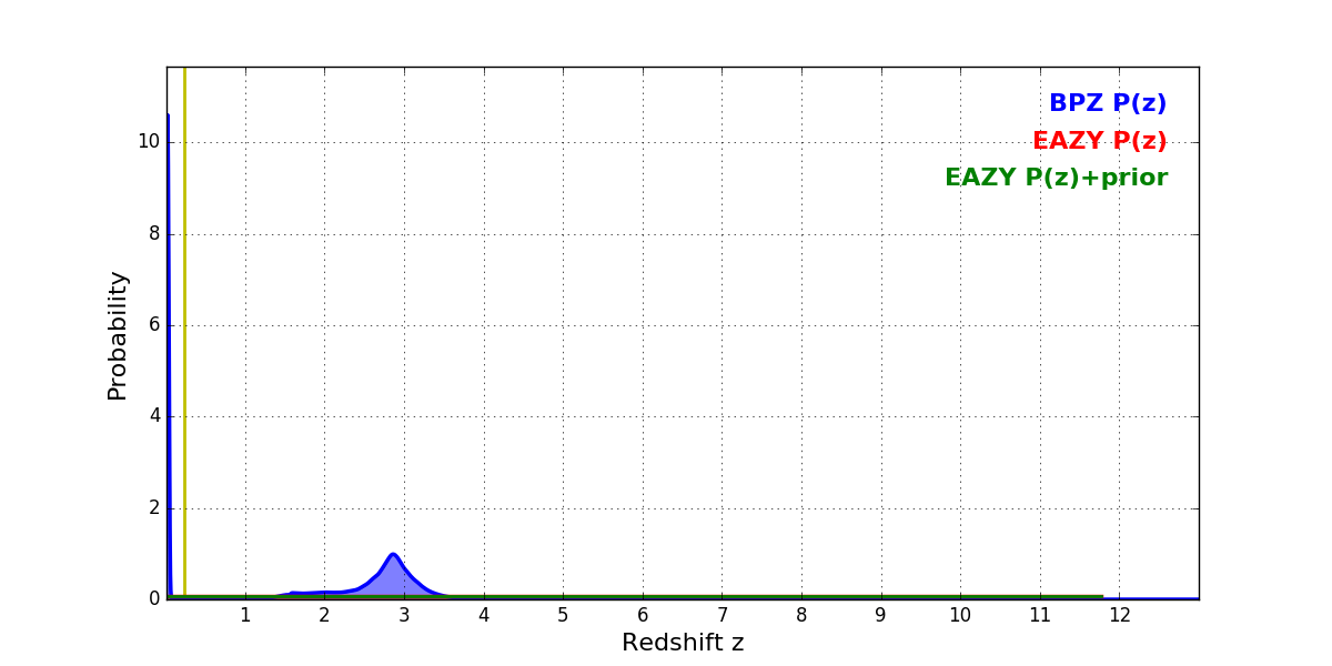 In P(z) plots: Yellow lines mark the cluster redshift z = 0.228,