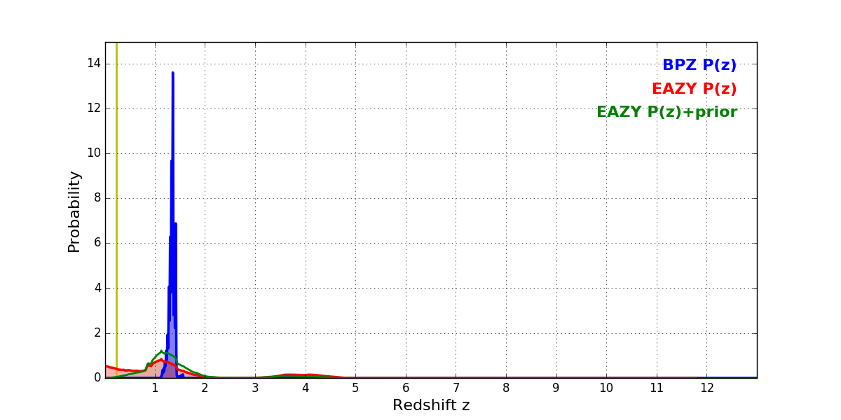 In P(z) plots: Yellow lines mark the cluster redshift z = 0.228,